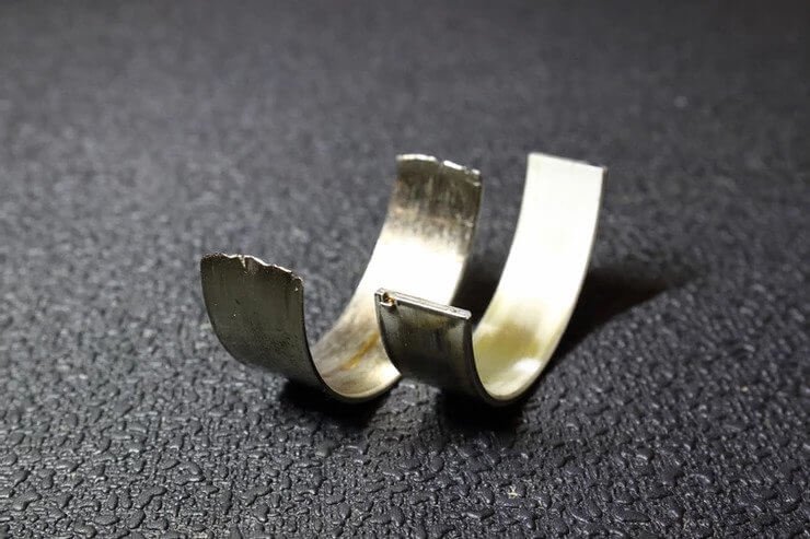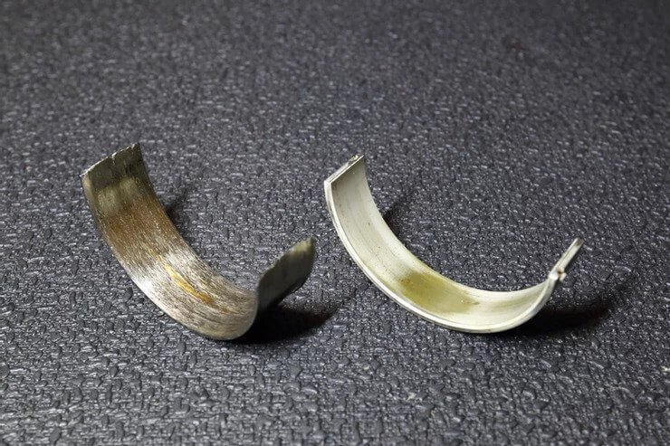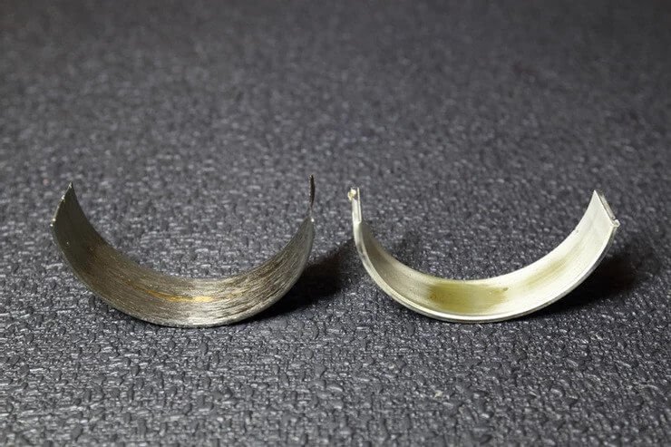 Failed rod bearing that grinded down the crankshaft journal. Side by side comparison with the normal one.