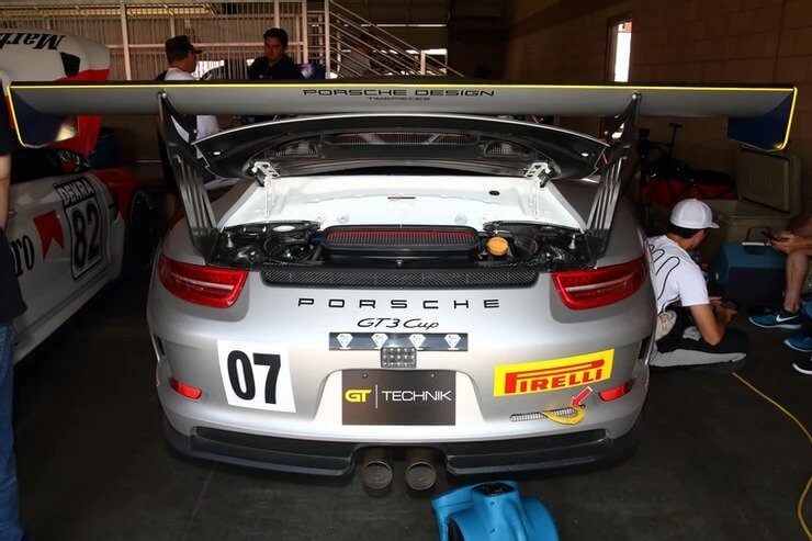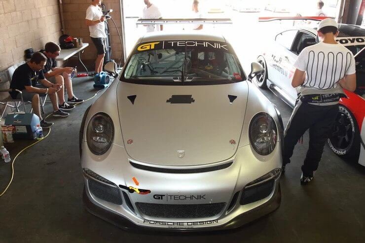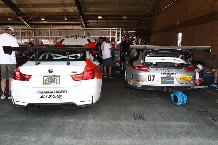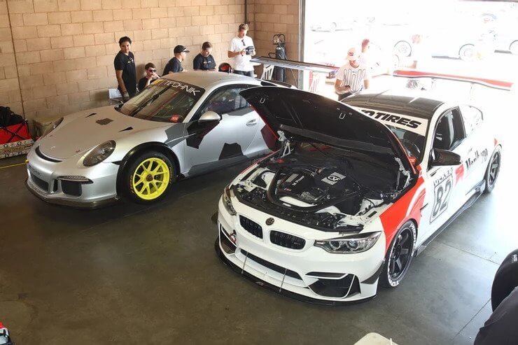 Porsche 991 GT3 Cup, BMW F82 M4, and Audi R8 inside GT Technik’s garage area.